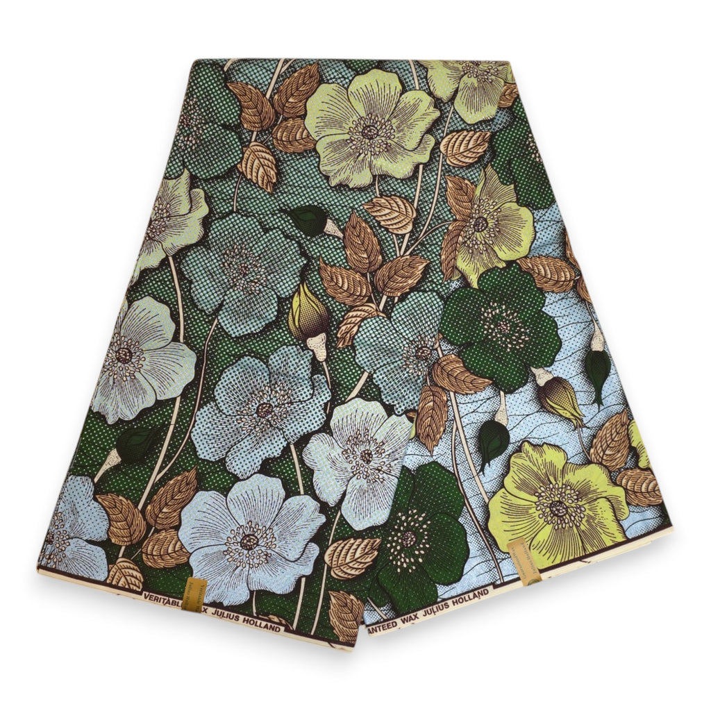 Tissu africain / tissu wax - Vert Bleu clair Vintage Garden Bloom - Effet spécial Brillant Platinum Edition
