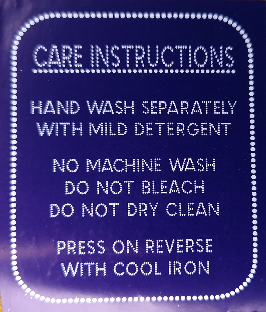 Instructions d'entretien particulières : Laver à la main à froid uniquement. Laver à la main séparément avec un détergent doux. Pas de lavage en machine. Ne pas blanchir. Ne pas nettoyer à sec. Repasser sur l'envers avec un fer à repasser froid. Ces instructions doivent être suivies pour préserver au maximum l'effet métallique.