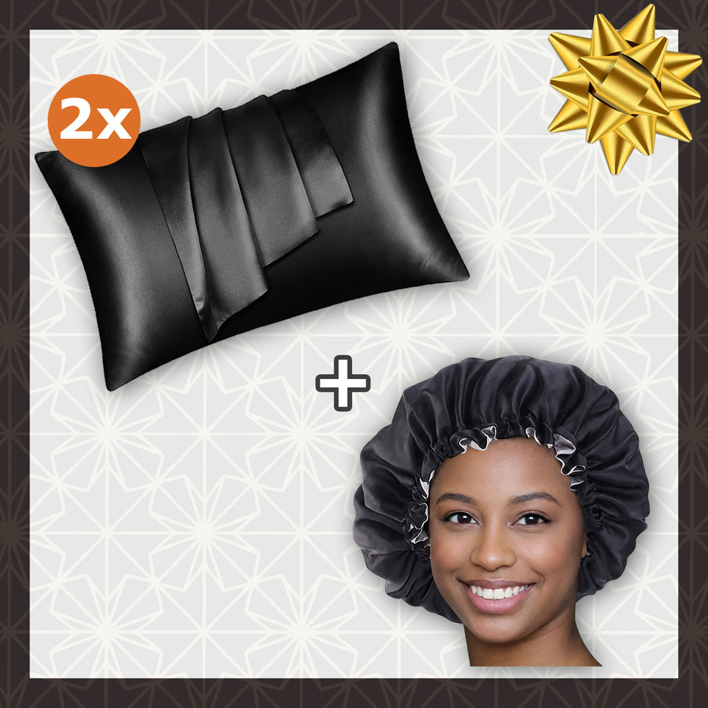 SET SATIN - Protégez vos cheveux et votre peau - Noir Bonnet en Satin + Taie d'oreiller en satin