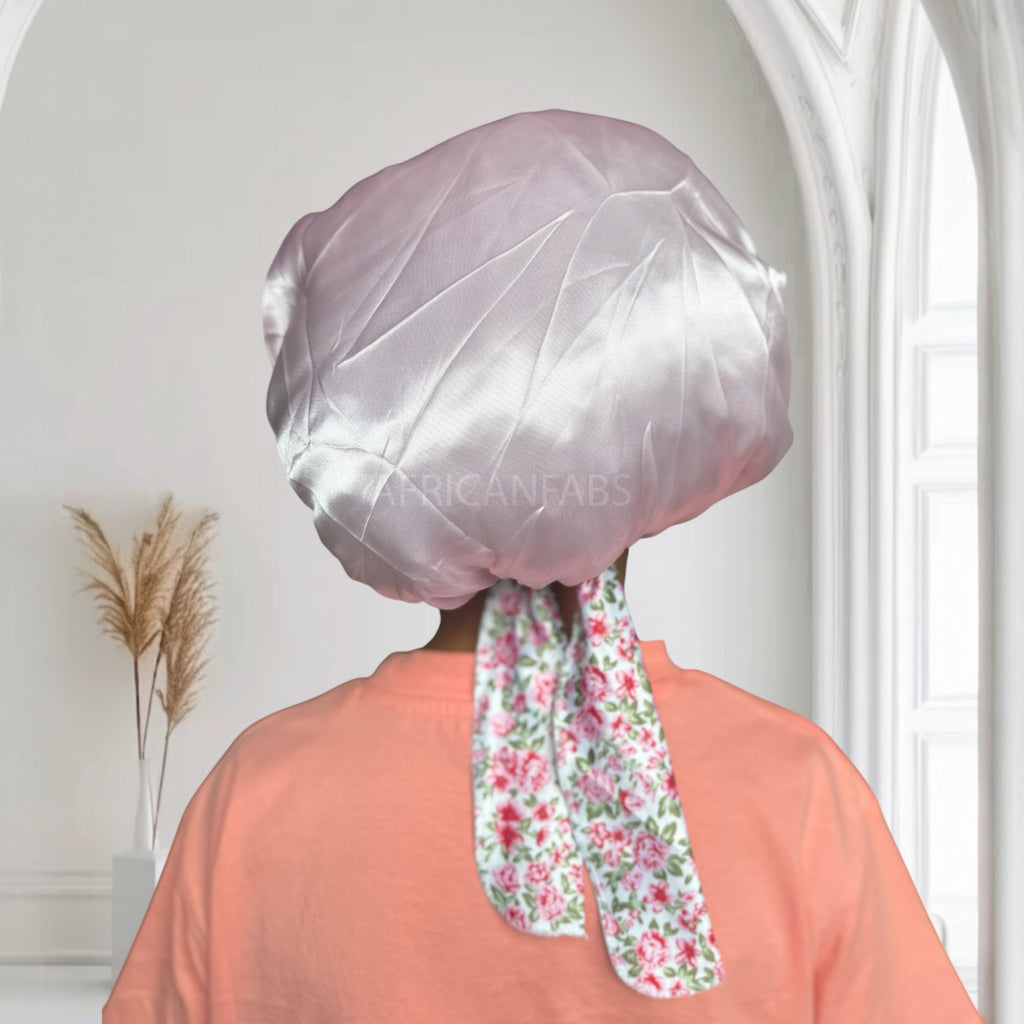 Bonnet en satin Rose fleur avec liens à nouer (taille enfant 3-7 ans) (bonnet de nuit en satin)