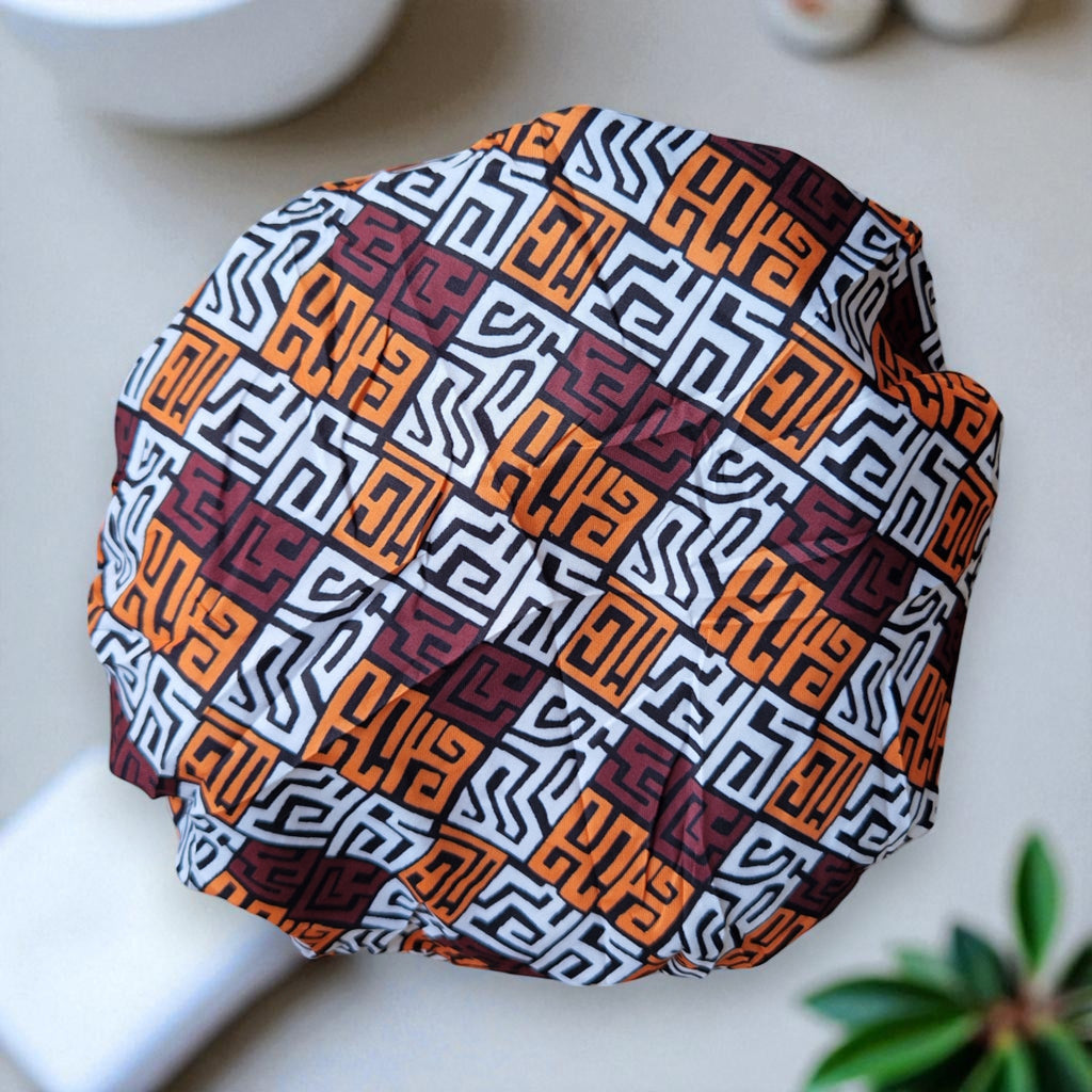 Grand Bonnet de douche extra large pour cheveux longs / boucles / afro - imprimé africain Marron et orange jaune Kuba Blocks Congo
